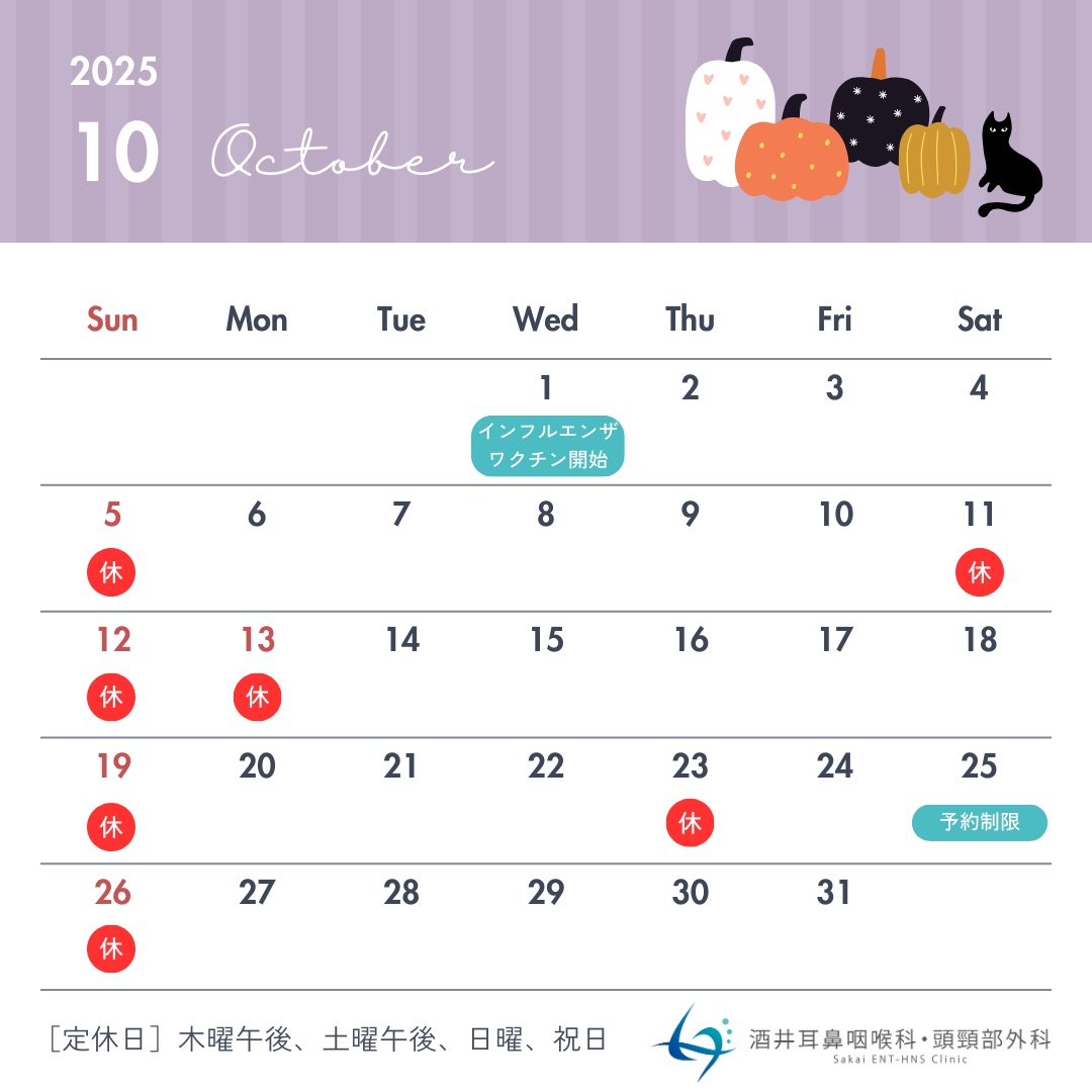 ・10月25日(土)の診療について:この日は事務スタッフが1名のみの勤務となりますため、当日予約枠を制限させていただきます。急な症状の方以外は、できるだけ別日でのご予約をお願いいたします。